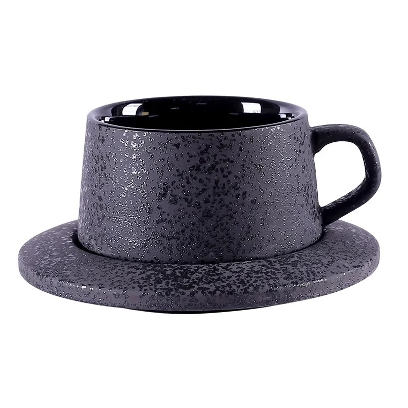 استمتع بإفطار راقي مع طقم فناجين قهوة وصحن بلوري عالي الجودة، يرافقه طبق سيراميك أنيق وكوب مريح.