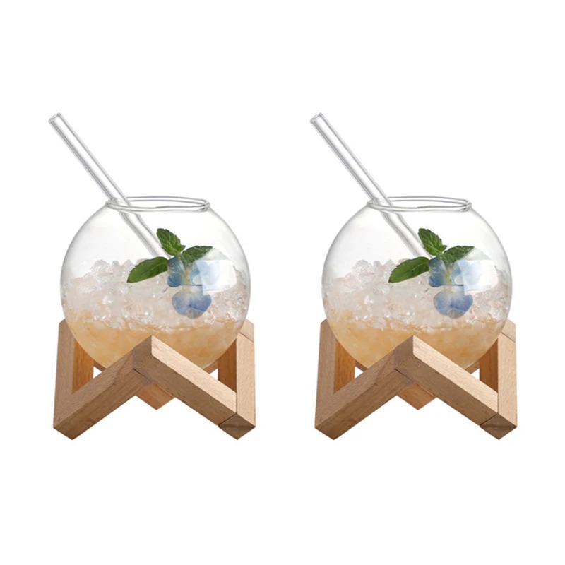 استمتع بتقديم مشروباتك بأسلوب مميز مع كوب زجاجي على شكل كرة شفاف، يأتي مع حامل خشبي من القش لإطلالة أنيقة وعملية.