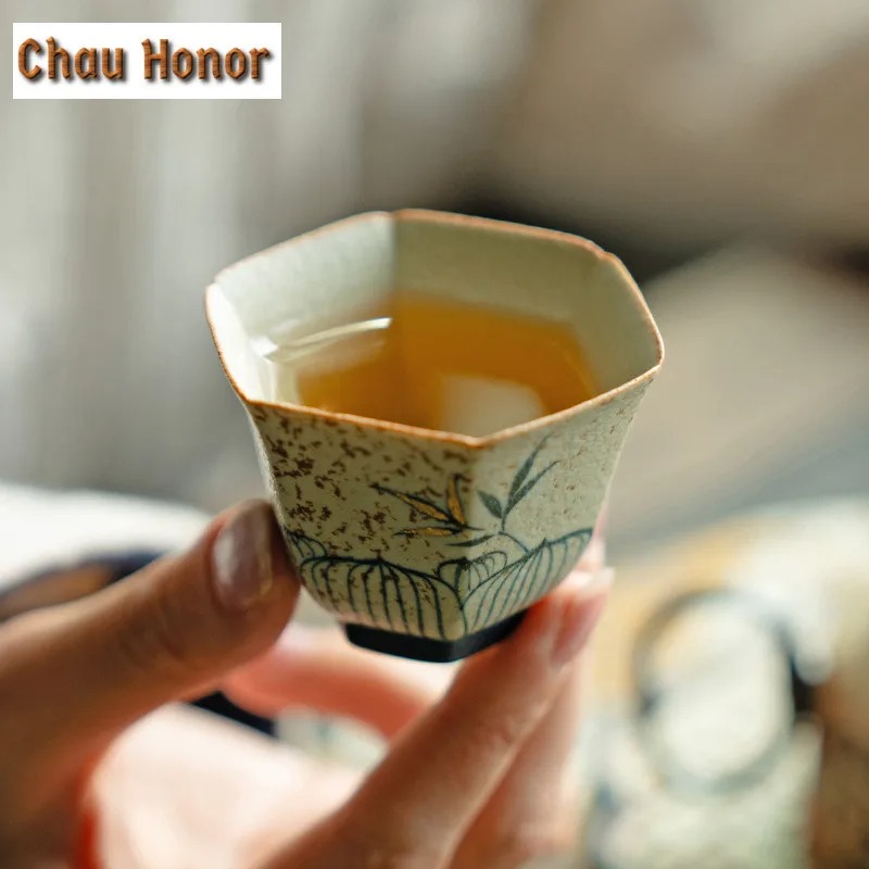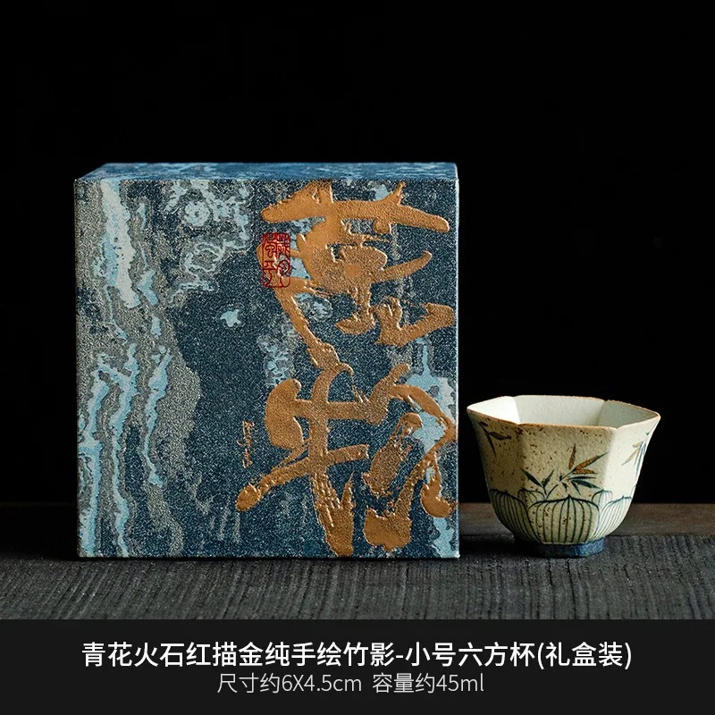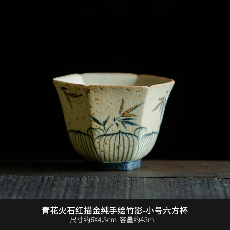 استمتع بتجربة شاي أصيلة مع فنجان 45 مللي مزخرف يدويًا بالأزرق والأبيض مع لمسات ذهبية، يرافقه وعاء شاي سداسي من الخيزران.
